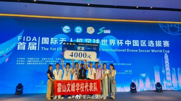 8月19日至21日,由中国航空学会、成都市体育局、成都市双流区人民政府主办的首届FIDA无人机足球世界杯中国区选拔赛(以下简称:FIDA选拔赛)在四川成都开赛。本次比赛吸引了来自全国21个省、自治区、直辖市306支参赛队伍(含单人赛队)1200余名选手参赛。霍山文峰学校代表队凭借精湛的技术与稳健的发挥,一举斩获全国第三名的好成绩。
