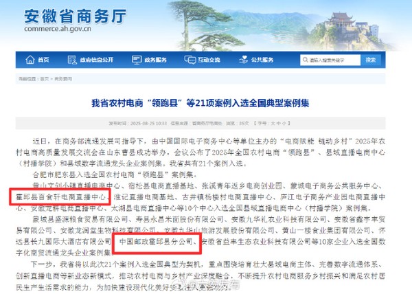 8月29日,在2025年全国农村电商高质量发展交流活动中,商务部公布了2025年县域直播电商中心(村播学院)和县域数字流通龙头企业案例集,六安市2个案例入选。其中,霍邱县百食轩电商直播中心入选全国县域直播电商中心案例集,中国邮政集团有限公司安徽省霍邱县分公司入选全国县域数字流通龙头企业案例集。